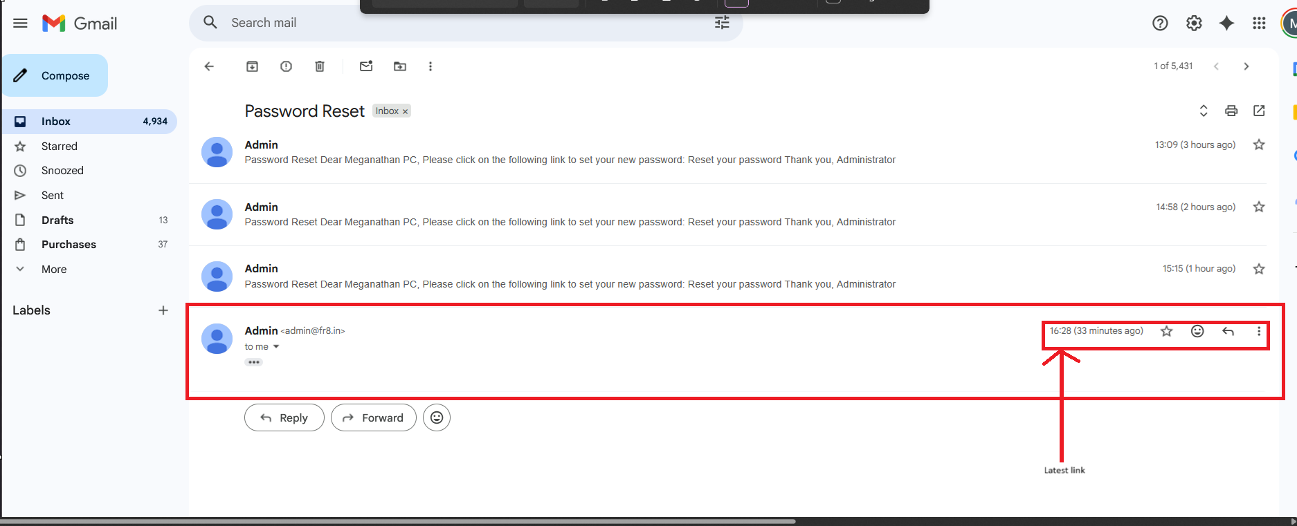 Step5: So, Click on the latest link with timestamp(Note:if you click on the old link and set password will show error as "The reset password link has either been used before or is invalid")