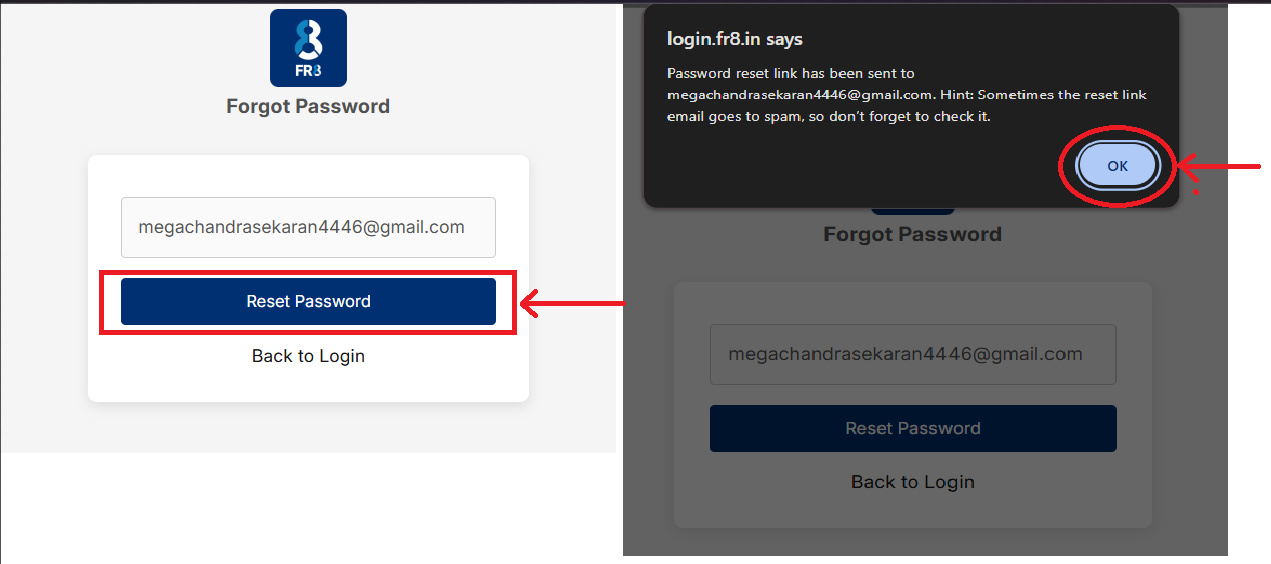 Click "OK" On the pop up notification(Password reset link has been sent to "registeredwithorganizationmail"@gmail.com. Hint: Sometimes the reset link email goes to spam, so don’t forget to check it.)